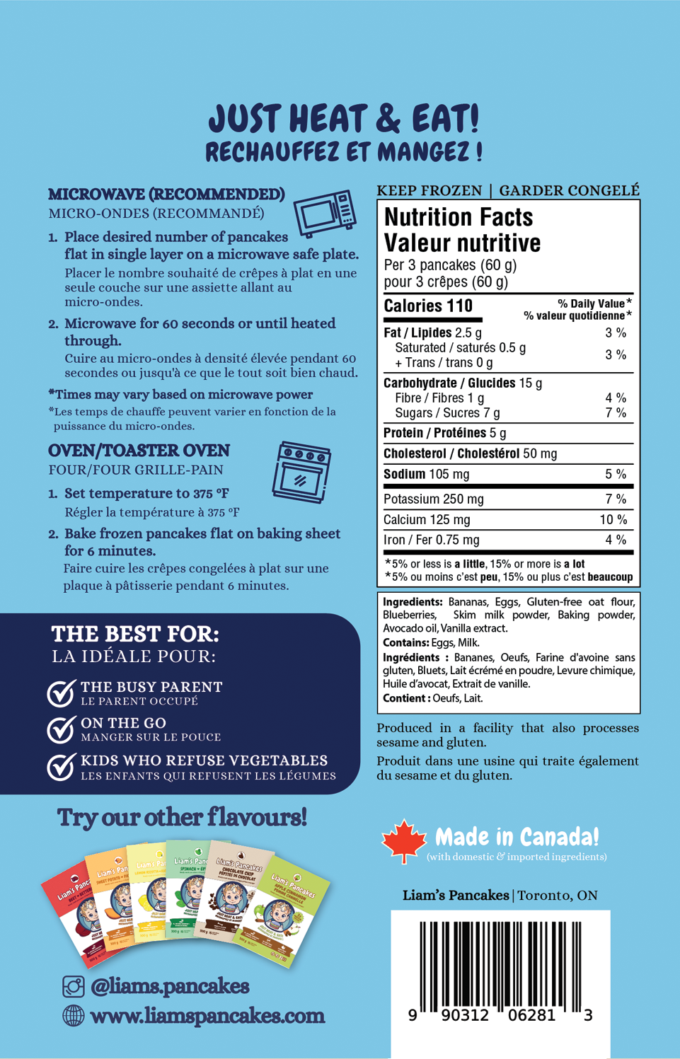 Ingredients: Blueberry, skim milk powder, banana, eggs, gluten free oat flour, baking powder, vanilla, avocado oil