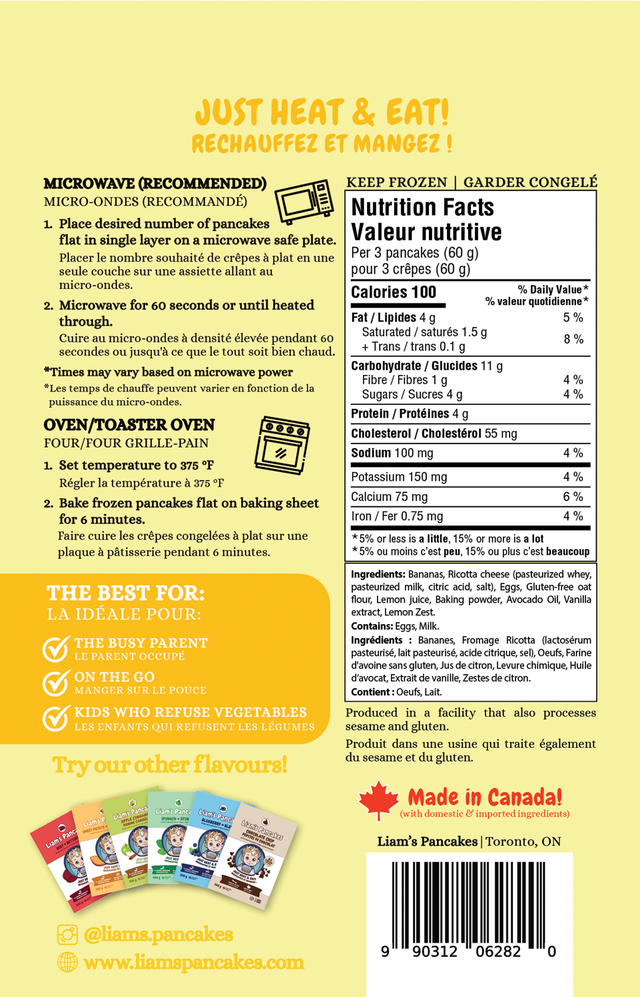 Ingredients: eggs, bananas, ricotta, oat flour, lemon zest, lemon juice, vanilla, baking powder